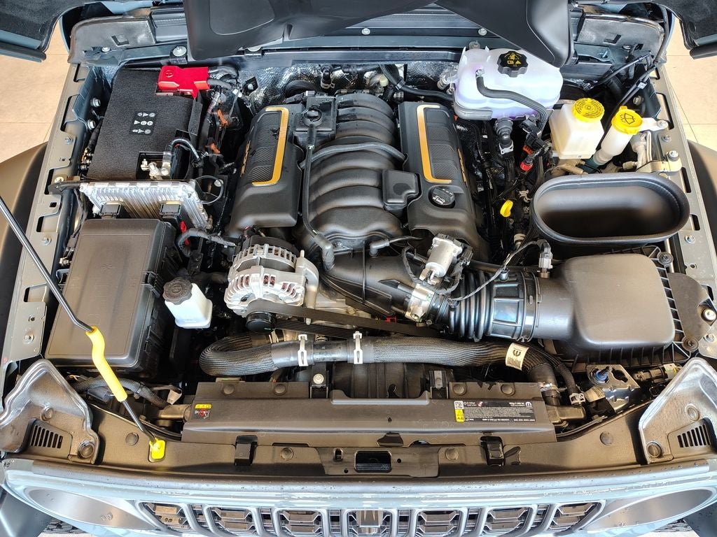 At its core, the Wrangler 392 is powered by a high-performance V8 engine paired with a responsive automatic transmission, delivering exhilarating acceleration and unmistakable Jeep capability. Engineered for serious off-road performance, it features Dana wide full-floating axles, a 4.56 rear axle ratio, and front and rear Tru-Lok electronic locking differentials. A front disconnecting stabilizer bar, rock-protection sill rails, and a transfer case skid plate provide the confidence to tackle challenging terrain with ease.
