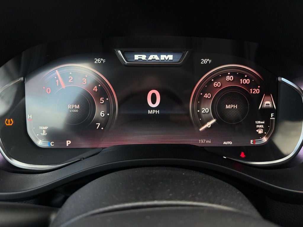 This Ram stands out with the Night Edition, adding 20-inch painted clad wheels, body-color bumpers, accent-color premium power mirrors, and bold exterior styling. The Bed Utility Group enhances work-ready capability with pickup box lighting, a Mopar spray-in bedliner, deployable bed step, adjustable cargo tie-down hooks, and an exterior 115-volt power outlet. A 33-gallon fuel tank extends driving range for longer trips, while active noise control and automatic-dimming mirrors contribute to a quieter, more refined ride.