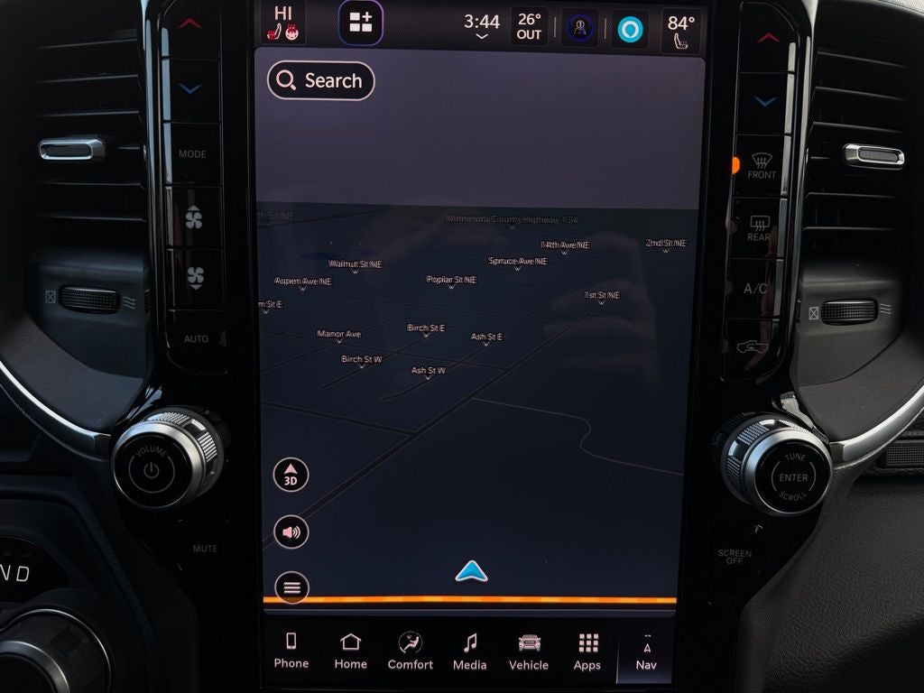 The spacious Crew Cab interior is designed for everyday comfort and long-haul convenience, featuring a leather-wrapped steering wheel, heated front seats, a heated steering wheel, and an 8-way power-adjustable drivers seat with power lumbar support. The Uconnect 5 navigation system with a large 12-inch touchscreen puts wireless Apple CarPlay and Android Auto, connected travel services, and SiriusXM 360L at your fingertips, while the 12-inch digital driver display delivers customizable vehicle information in crisp detail. Dual-zone automatic climate control, a rear power-sliding window, in-floor second-row storage bins, and a premium 9-speaker audio system with subwoofer make every drive around Wright County more enjoyable.