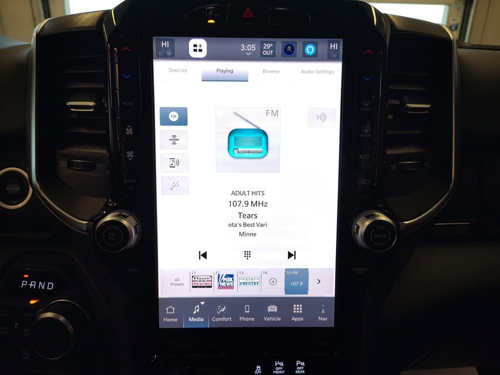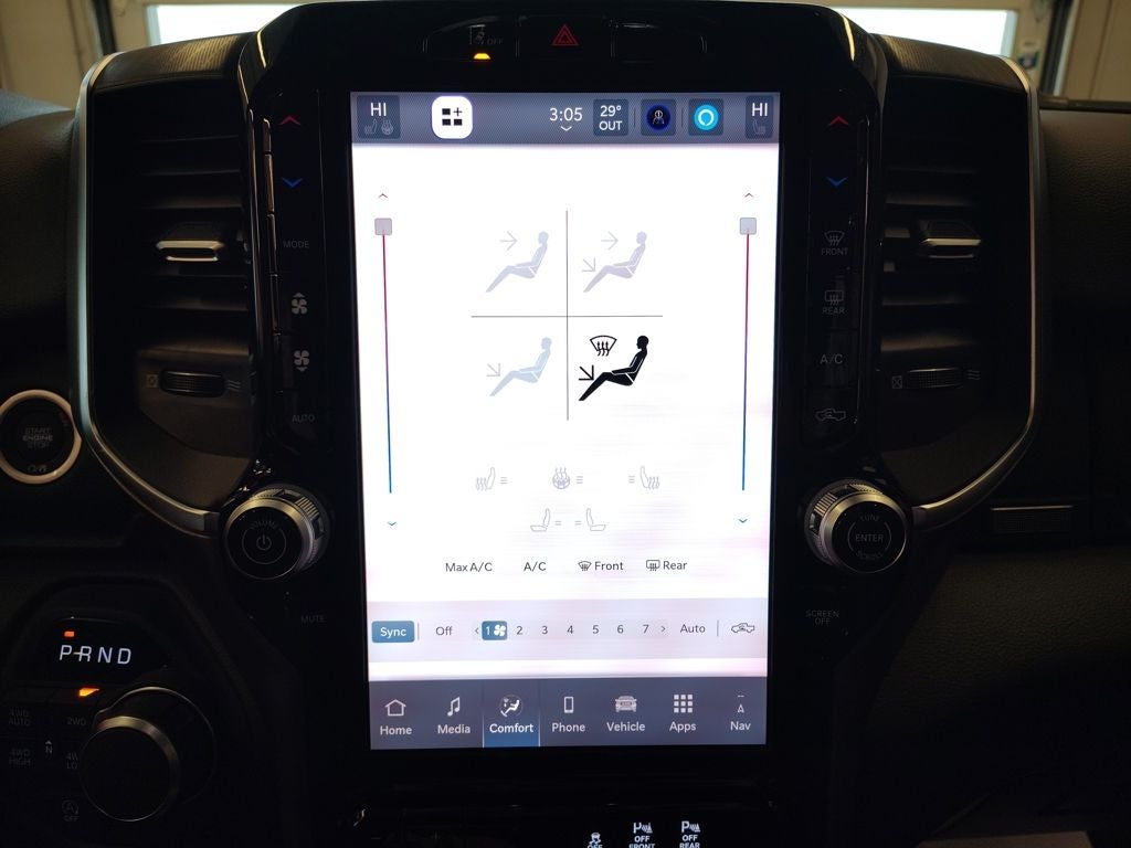 Inside, the spacious Crew Cab delivers comfort and connectivity for every passenger. Heated front seats, a heated leather-wrapped steering wheel, and dual-zone automatic climate control create a welcoming environment in all seasons. The Uconnect 5 navigation system with a large 12-inch touchscreen integrates wireless Apple CarPlay and Android Auto, connected travel services, and SiriusXM 360L, while a 7-inch digital driver display keeps key vehicle information clearly in view. An 8-way power-adjustable drivers seat with power lumbar support, second-row in-floor storage bins, and a rear power-sliding window add everyday convenience and versatility.