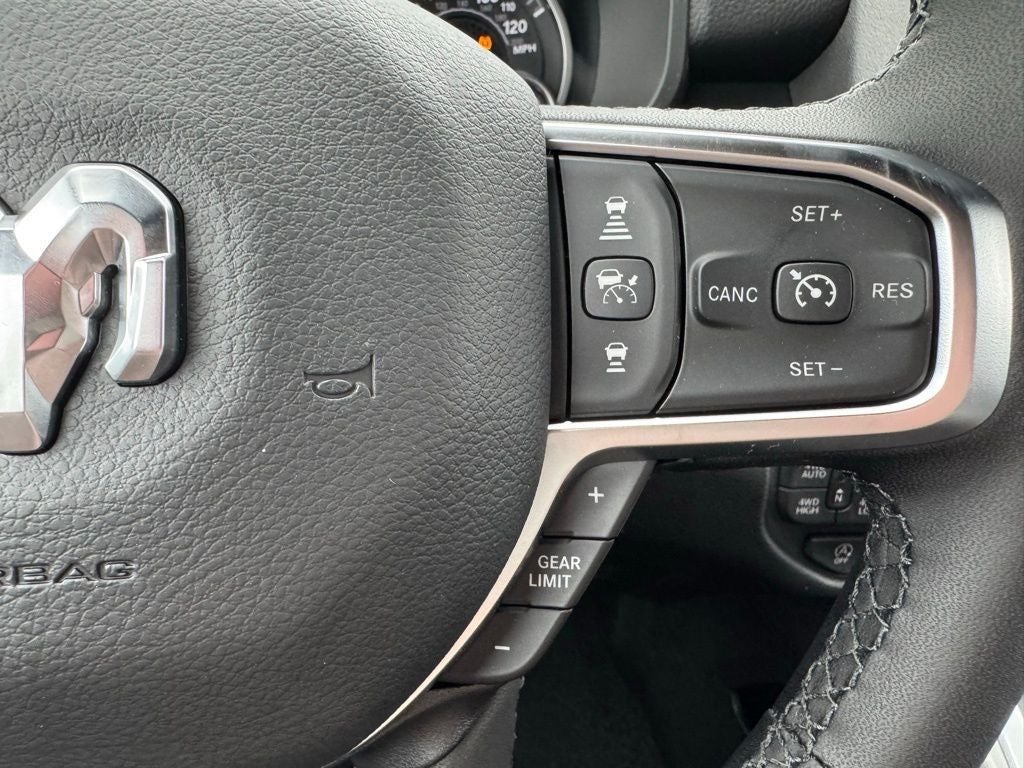 This truck is further enhanced by the Big Horn Level 2 Equipment Group, adding heated front seats, a heated steering wheel, an 8-way power adjustable driver seat with lumbar support, dual-zone automatic climate control, a leather-wrapped steering wheel, power adjustable pedals, rear power sliding window, and second-row in-floor storage bins for added versatility. The Uconnect 5 navigation system with a 12-inch touchscreen delivers crisp graphics, intuitive controls, connected travel services, and seamless smartphone integration, while a nine-speaker amplified audio system with subwoofer provides impressive sound quality.