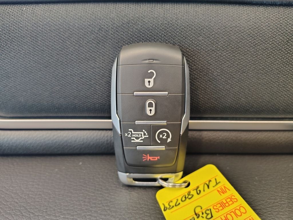 Inside, the spacious Crew Cab offers thoughtful comfort and modern technology. Heated front seats, a heated steering wheel, an eight-way power driver seat with power lumbar, leather-wrapped steering wheel, rear center armrest, and dual-zone automatic climate control create a welcoming environment for daily driving or long trips. The Uconnect 5 system with a 12-inch touchscreen and built-in navigation anchors the dashboard, paired with a 7-inch digital cluster display, connected travel and traffic services, and a nine-speaker audio system with subwoofer. Practical features such as power-adjustable pedals, a rear power-sliding window, in-floor rear storage bins, a 115-volt auxiliary outlet, power tailgate release, and a 400-watt inverter add everyday convenience.