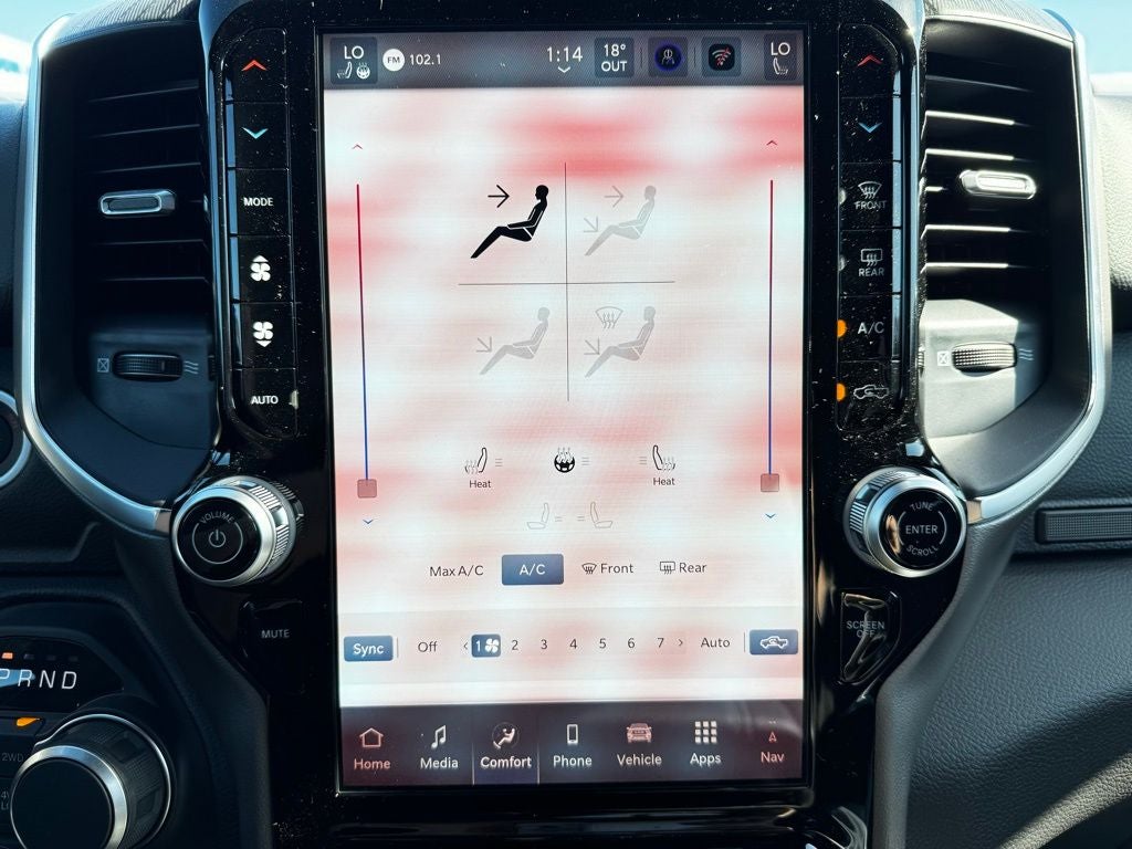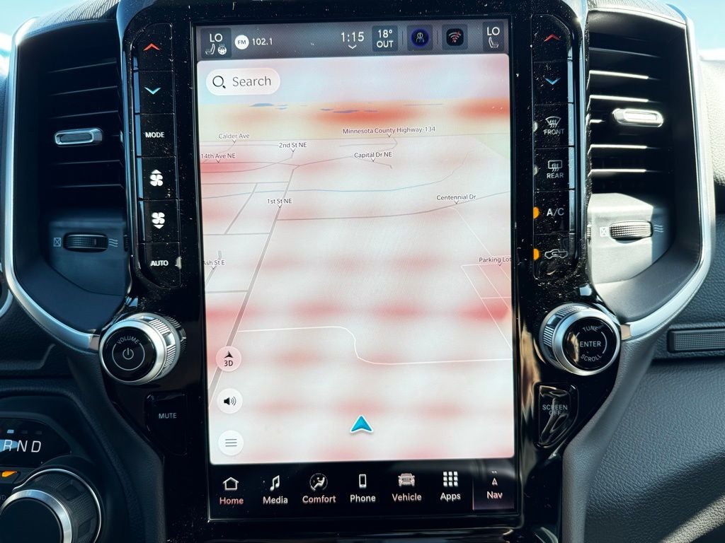 Inside, the Ram 1500 Big Horn Crew Cab 4x4 offers an exceptionally comfortable and well-equipped cabin. The Big Horn Level 2 Equipment Group enhances the interior with heated front seats, a heated steering wheel, an 8-way power-adjustable driver seat with lumbar support, and a 60/40 split-folding rear seat that allows for flexible cargo and passenger configurations.