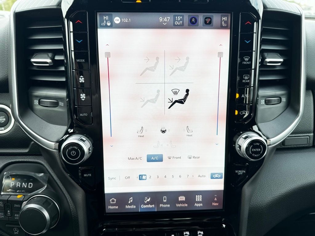 The Uconnect 5 Nav system with a 12-inch touchscreen integrates navigation, SiriusXM 360L, connected travel and traffic services, and smartphone connectivity for seamless control of your drive. A 9-speaker amplified audio system with subwoofer fills the cabin with rich sound, while multiple power outlets, including a 115-volt auxiliary rear outlet, ensure you stay connected and powered on the go. Additional interior touches like a universal garage door opener, automatic-dimming rearview mirror, in-floor storage bins, and front seat-back map pockets reflect Rams thoughtful design approach.