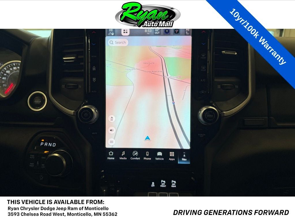 Inside, the Big Horn Level 2 Equipment Group transforms the cabin with premium comfort and convenience enhancements. Features include heated front seats, a heated leather-wrapped steering wheel, an 8-way power drivers seat with lumbar support, a 60/40 split-folding rear bench, dual-zone automatic climate control, automatic-dimming rearview mirror, power-folding exterior mirrors, and a universal garage door opener. Practical touches like second-row in-floor storage bins, front seat-back map pockets, a rear sliding window, and a 115-volt auxiliary outlet make this truck ready for daily use.