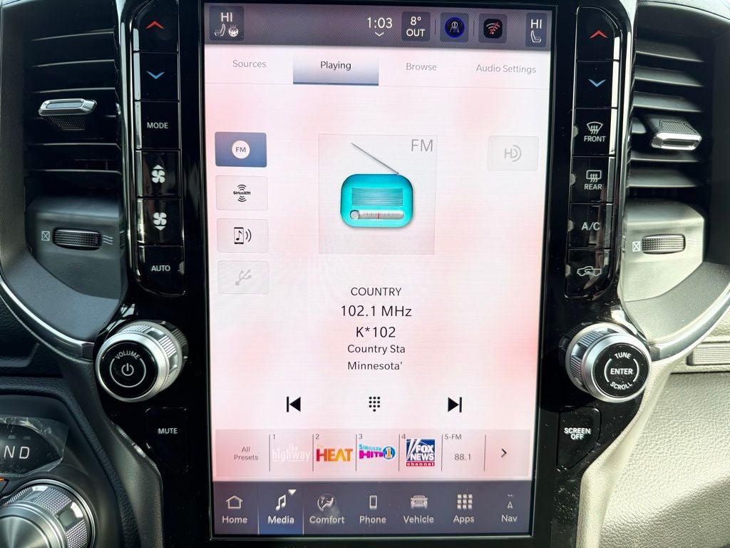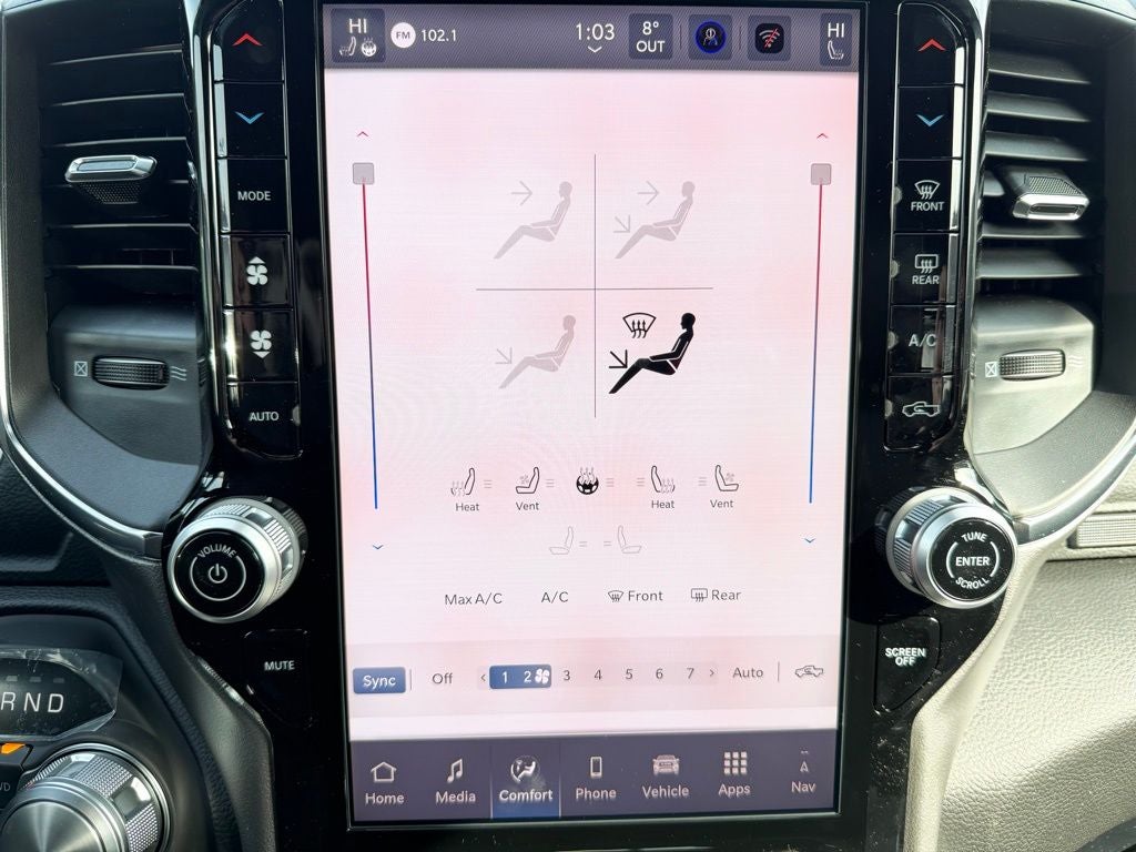 Inside, the Laramie cabin offers premium craftsmanship with leather-trimmed bucket seats, dual-zone automatic climate control, and a quiet, comfortable ride designed for long trips and busy days alike. The Laramie Level 1 Equipment Group adds thoughtful convenience with a crisp digital driver display, rain-sensitive windshield wipers, and modern driver-focused controls. The Laramie Preferred Package elevates the experience further with a large Uconnect touchscreen featuring wireless Apple CarPlay and Android Auto, enhanced connectivity, and premium interior details that make every drive feel first class.