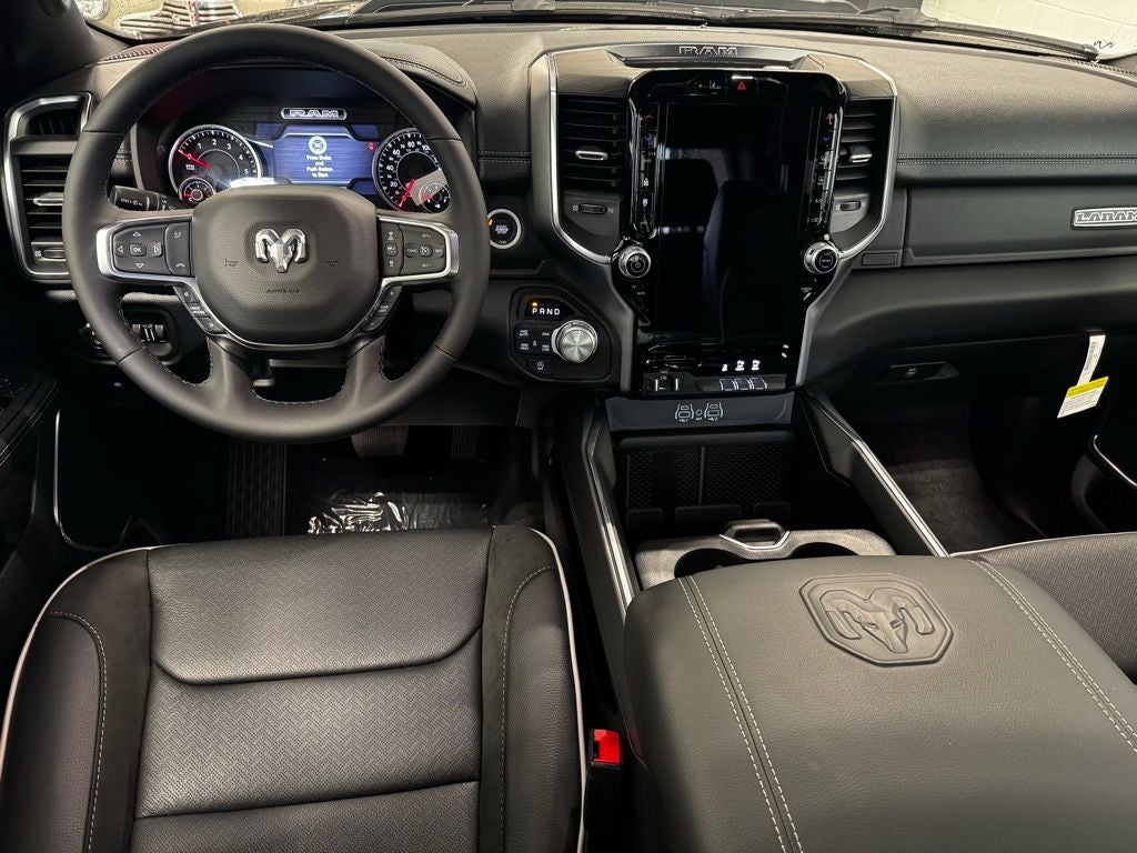 Inside, the Ram 1500 Laramie is designed to impress with premium features and advanced technology. Standard equipment includes leather-trimmed seating, heated and ventilated front seats, heated rear seats, a heated steering wheel, dual-zone automatic climate control, and a power-adjustable drivers seat with memory. The Uconnect 5 infotainment system with a large touchscreen provides wireless Apple CarPlay, Android Auto, Bluetooth®, and available navigation, while a premium audio system ensures an immersive listening experience.