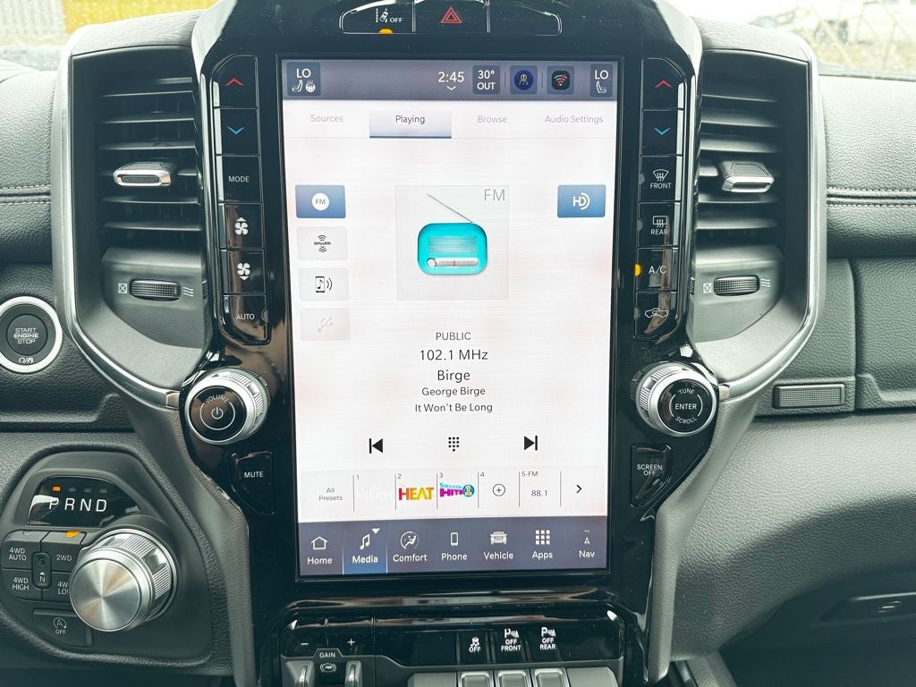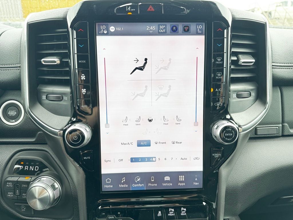 Inside, the Laramie offers premium refinement with leather-trimmed seating, heated and ventilated front seats, heated rear seats, a heated steering wheel, dual-zone automatic climate control, and advanced in-cabin storage solutions for added convenience. The Uconnect 5 system with a large touchscreen keeps you connected with Apple CarPlay, Android Auto, and available navigation, while premium audio ensures entertainment for every drive.