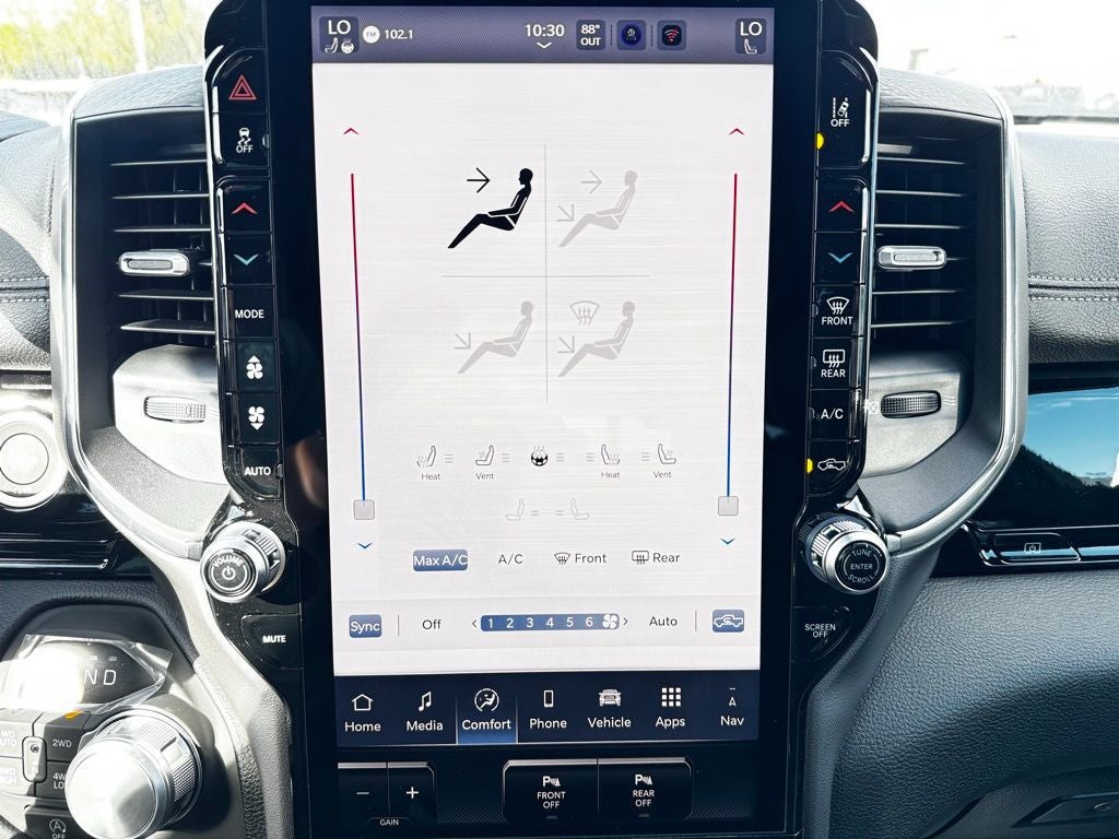 Standard Laramie features further enhance the experience with leather-trimmed seating, heated and ventilated front seats, heated rear seats, a heated steering wheel, remote start, multi-zone automatic climate control, and abundant storage solutions including in-floor bins. Advanced safety features, including adaptive cruise control, lane-keeping assist, blind-spot monitoring, and a surround-view camera system, provide peace of mind on every journey.