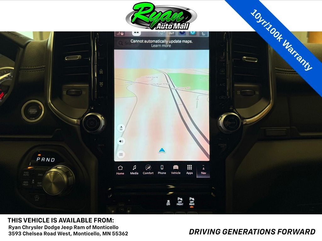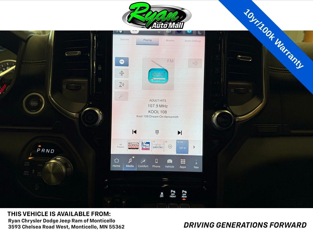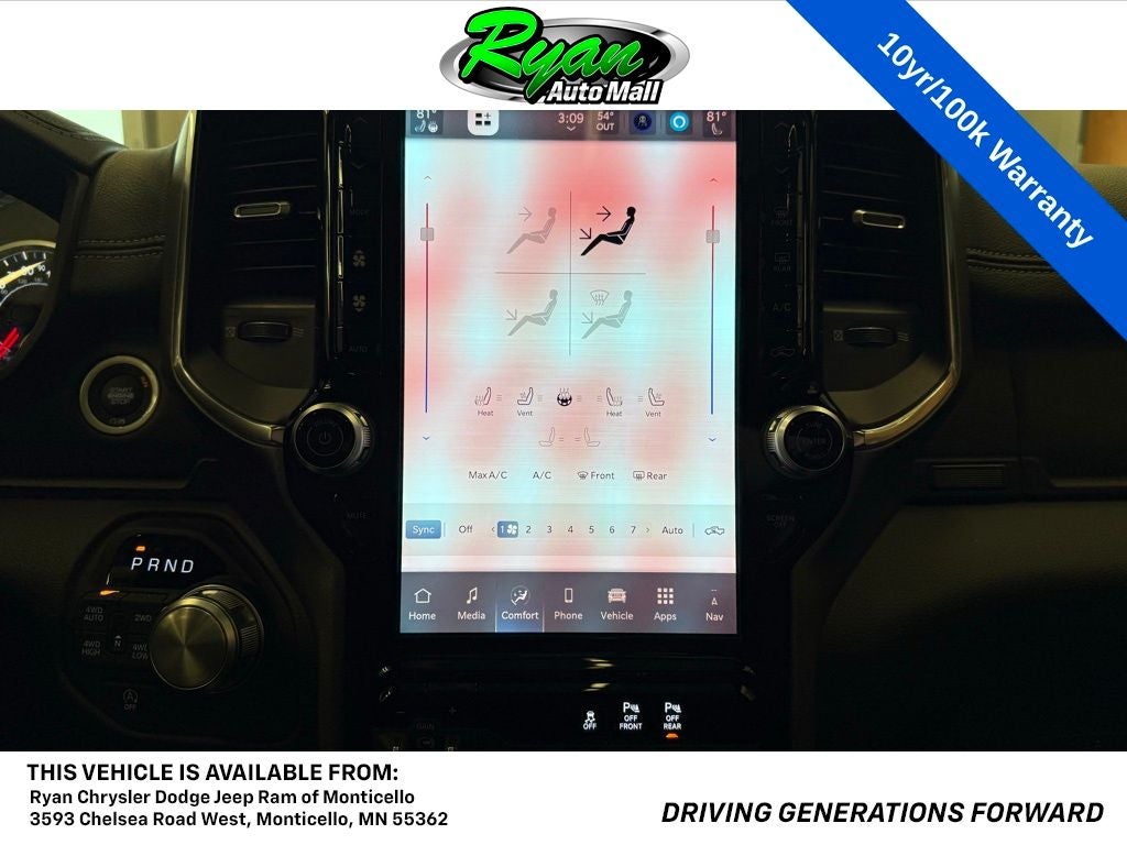 The exterior of this Laramie commands attention in its striking Diamond Black Crystal Pearl-Coat finish. The Laramie Preferred Package adds both function and refinement with power deployable running boards, body-color front and rear bumpers, accent-color premium power mirrors, and durable tow hooks for practical utility. The dual-pane panoramic sunroof floods the cabin with natural light, creating an open and airy atmosphere. Rain-sensitive windshield wipers and a power tailgate release provide everyday convenience, especially during unpredictable Minnesota weather. Chrome details and the trucks bold Ram grille complete a look thats both rugged and upscale.