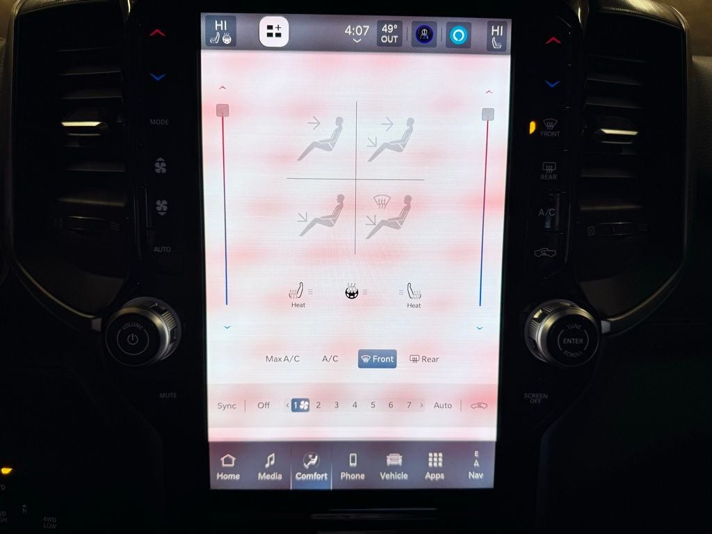 This Big Horn adds the Premium Cloth Bucket Seat upgrade and the Customer Preferred Package 2UZ, enhancing comfort with heated front seats and a heated steering wheel. The Night Edition package adds a bold, blackout appearance with painted front and rear bumpers, 20-inch black aluminum wheels, and darkened exterior accents. The Big Horn Level 1 Plus Equipment Group elevates convenience with a fold-flat load floor, emergency vehicle alert system, a glove box lamp, Uconnect 5 NAV with a 12-inch touchscreen, second-row in-floor storage bins, and power heat, fold, and telescoping trailer-tow mirrors. Added technology includes trailer tow pages, a dual-zone automatic climate control system, an 8-way power driver seat, forward and reverse utility lights, LED bed lighting, deployable bed step, and a premium Alpine audio system with subwoofer. SiriusXM 360L, remote start, and enhanced interior storage further improve everyday usability.