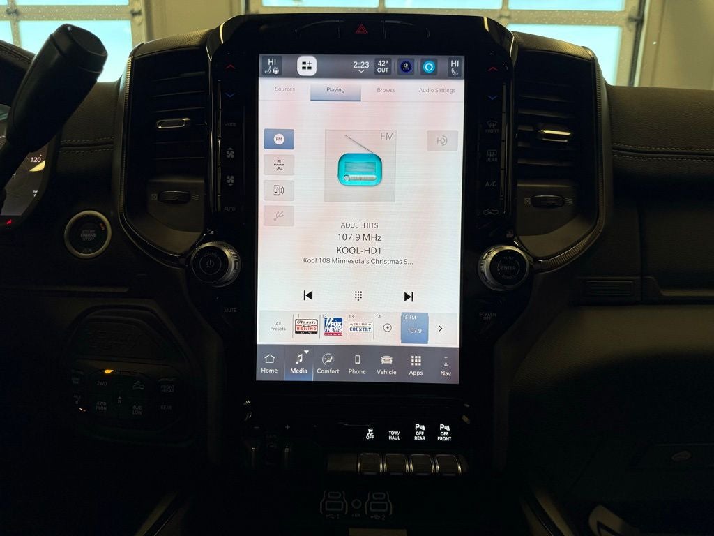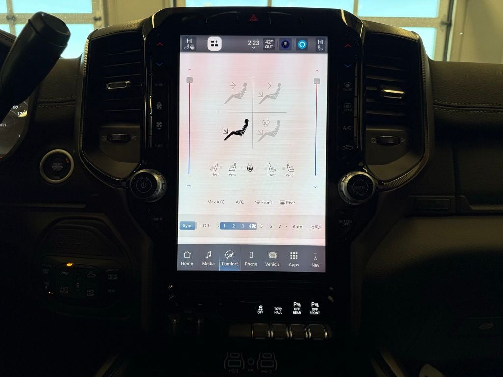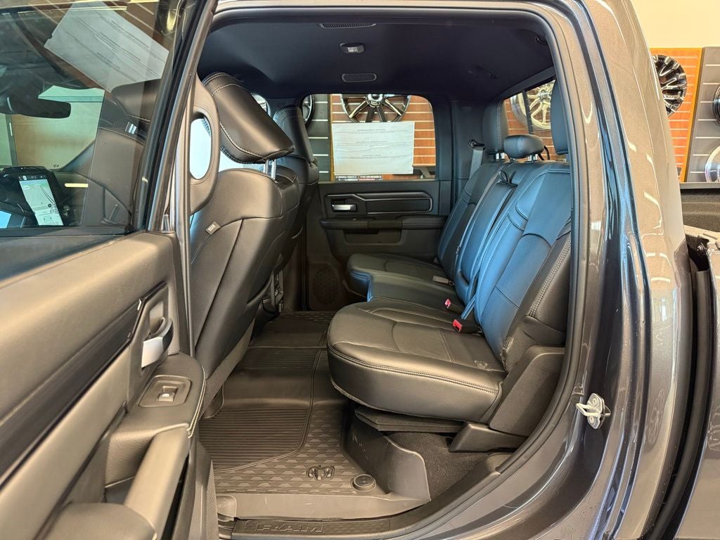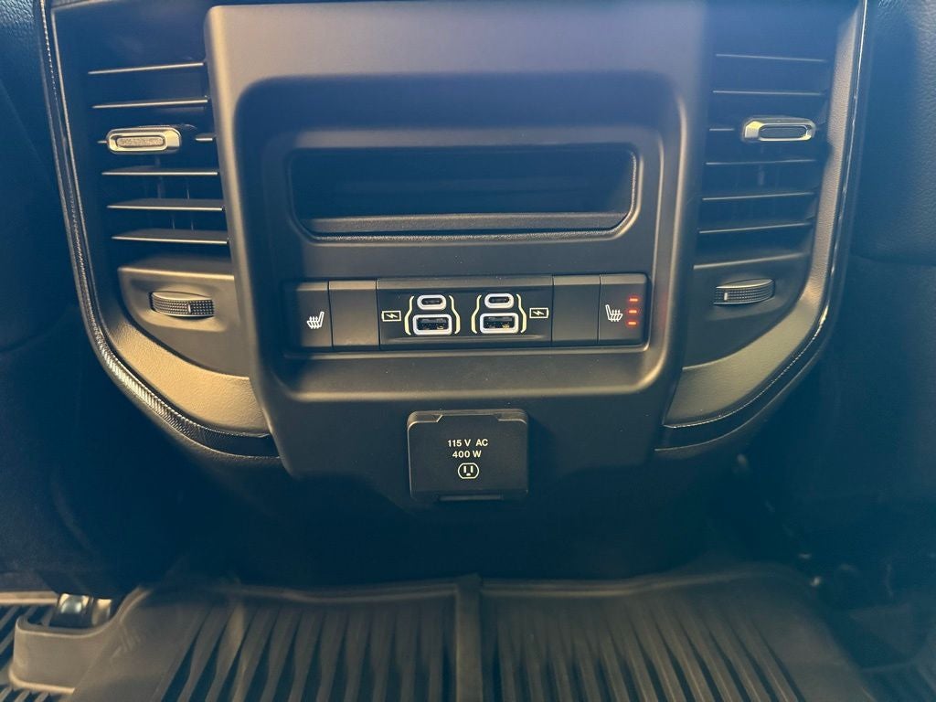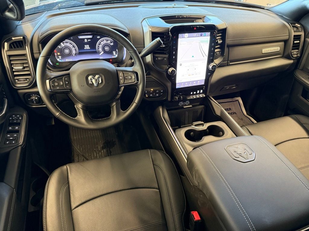 Inside the Crew Cab, the Power Wagon Level 1 Equipment Group elevates comfort with leather-trimmed bucket seats, ventilated front seats, heated second-row seating, and power-adjustable front seats with lumbar support for both driver and passenger. Memory settings for the drivers seat, pedals, mirrors, and radio add daily convenience, while power heat, fold, and telescoping mirrors with auto-dimming and reverse adjustment enhance visibility when towing or maneuvering. Dual wireless charging pads, illuminated vanity mirrors, rain-sensing wipers, and Mopar front and rear rubber floor mats round out a thoughtfully designed interior.