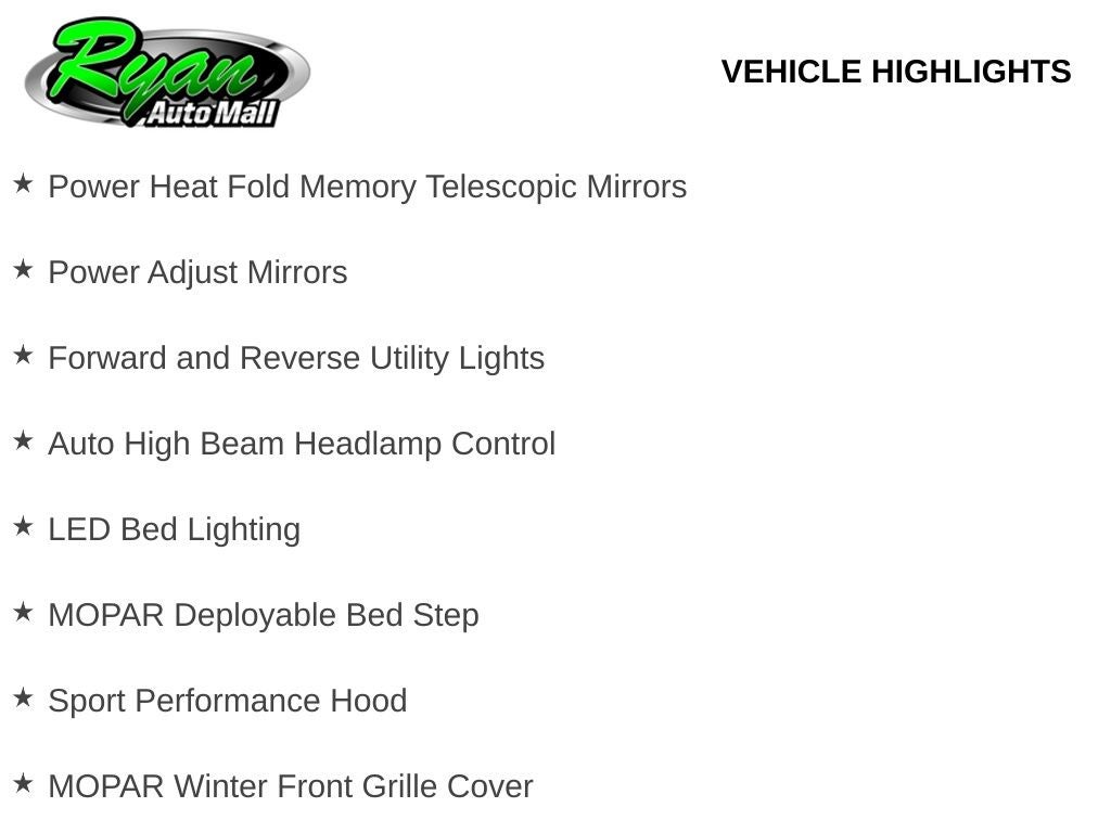 Additional premium features include a spray-in Mopar bedliner, rain-sensing windshield wipers, a deployable bed step, 2nd-row in-floor storage bins, rubber Mopar floor mats, adaptive steering, power sunroof, instrument panel auxiliary switches, and clearance lamps for improved visibility.