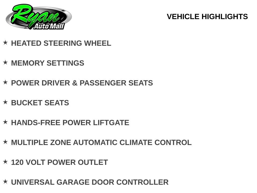 Inside, the Premier trim offers an upscale and well-equipped cabin designed for comfort in every season. Leather upholstery, heated and ventilated front seats, heated second-row seats, and a heated steering wheel provide exceptional comfort for both driver and passengers. Power driver and passenger seats with memory settings and dual-zone automatic climate control create a personalized driving experience, while a hands-free power liftgate, remote start, universal garage door controller, and a 120-volt power outlet add everyday convenience.