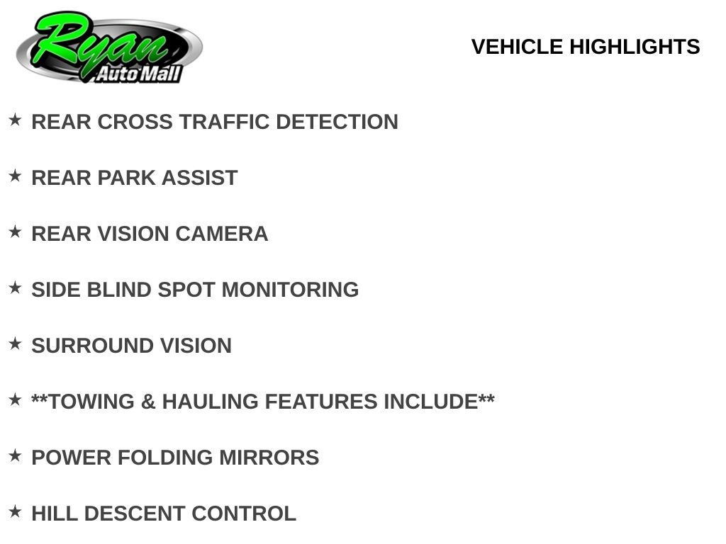 Safety and driver assistance features include adaptive cruise control, automatic emergency braking, forward collision alert, blind spot monitoring, rear cross traffic detection, surround vision, rear park assist, automatic high beam headlamps, and a rear vision camera, helping provide confidence on every drive.