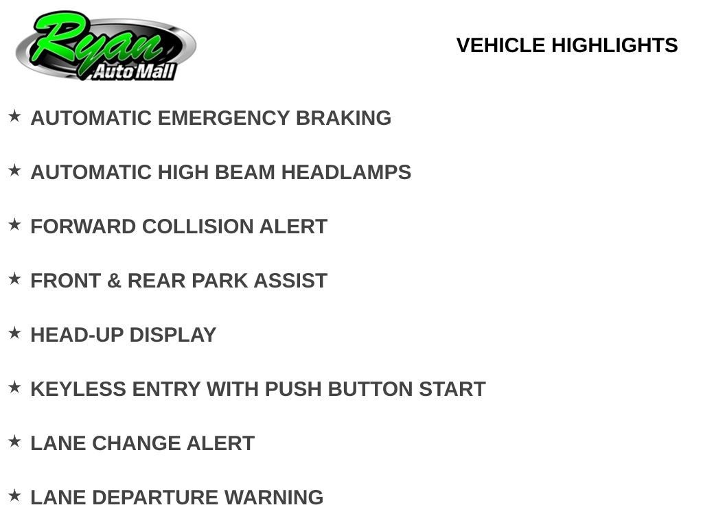 Safety and driver assistance features include adaptive cruise control, automatic emergency braking, forward collision alert, lane keep assist, lane departure warning, blind spot monitoring, rear cross traffic detection, surround vision, a head-up display, and front and rear park assist, helping provide confidence on every drive.