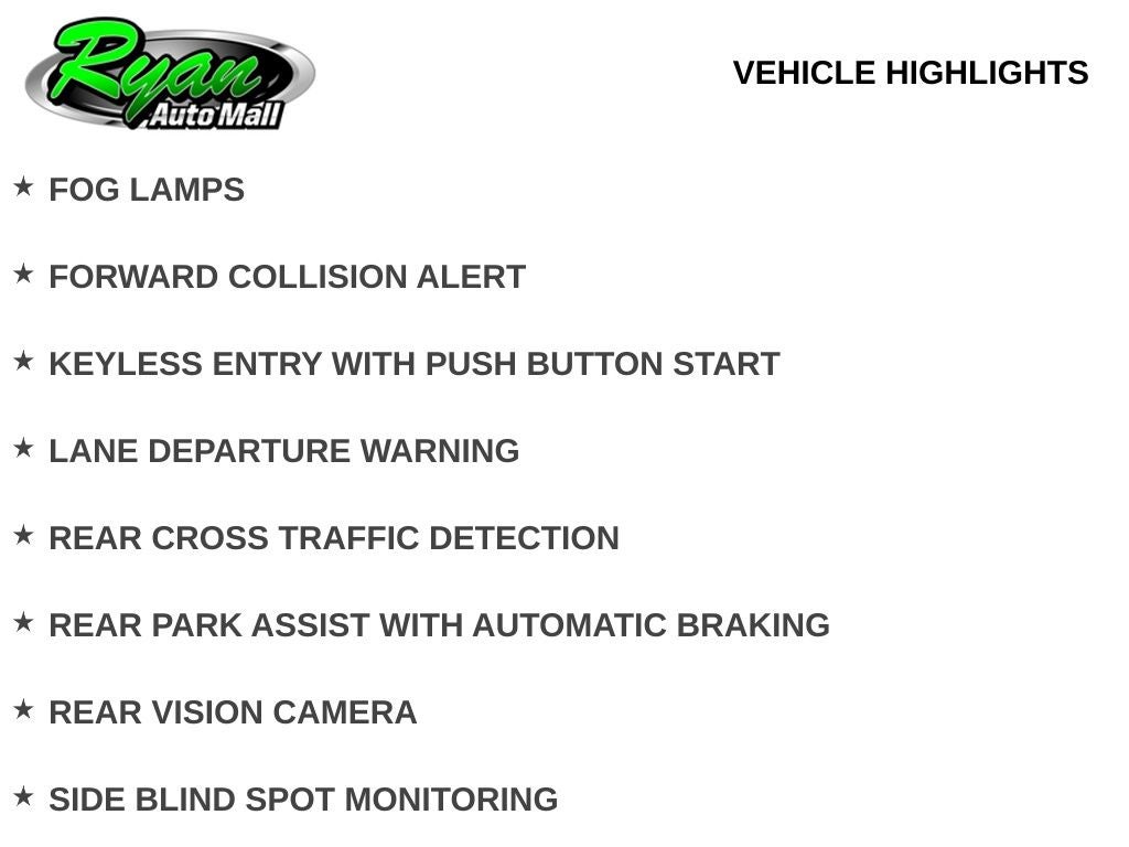 Safety and driver assistance technologies are abundant, including forward collision warning, lane departure warning, blind spot monitoring, rear cross path detection, rear park assist with automatic braking, and a rear vision camera. Fog lamps enhance visibility in challenging conditions, adding another layer of confidence behind the wheel.