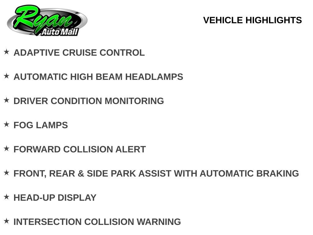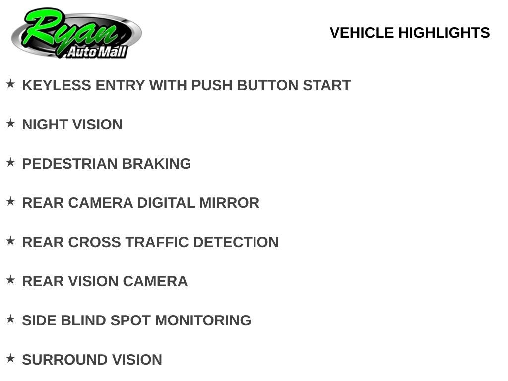 Additional features include a hands-free power liftgate, power sunroof, multi-zone automatic climate control, a power tilt and telescoping steering column, a 120-volt power outlet, a universal garage door controller, remote start, and a rear window defroster. Advanced safety technologies include adaptive cruise control, active lane management, forward collision alert with pedestrian braking, automatic high beam headlamps, blind spot monitoring, rear cross traffic detection, surround vision, front, rear, and side park assist with automatic braking, a head-up display, night vision, and traffic sign recognition.