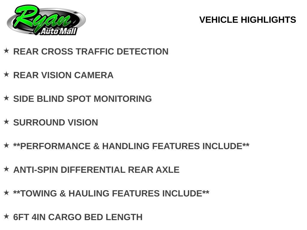 Driver-assist and safety features include adaptive cruise control, lane keep assist, forward collision alert, automatic high-beam headlamps, front and rear park assist, surround view camera system, digital rearview mirror, rear cross traffic detection, blind spot monitoring, and a rear vision camera to help enhance confidence on the road or while maneuvering with a trailer.
