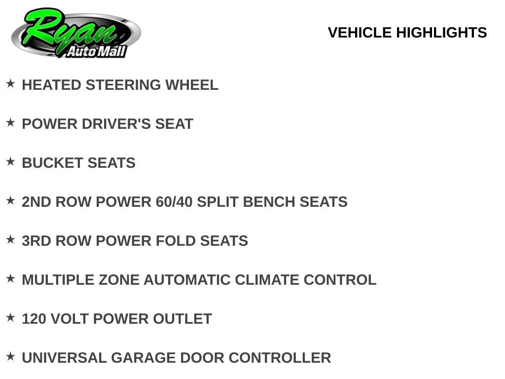 Inside, enjoy spacious eight-passenger seating with power-folding second- and third-row seats for incredible flexibility. Synthetic leather upholstery, heated and ventilated front seats, heated steering wheel, and a power driver’s seat ensure comfort in all seasons. Multi-zone automatic climate control, a universal garage door controller, remote start, 120-volt power outlet, and a rear window defroster enhance convenience for daily errands, school drop-offs, and long family road trips. An 8-inch touchscreen, built-in navigation, wireless device charging, Apple CarPlay and Android Auto capability, and 4G LTE Wi-Fi keep everyone connected and entertained on the go.
