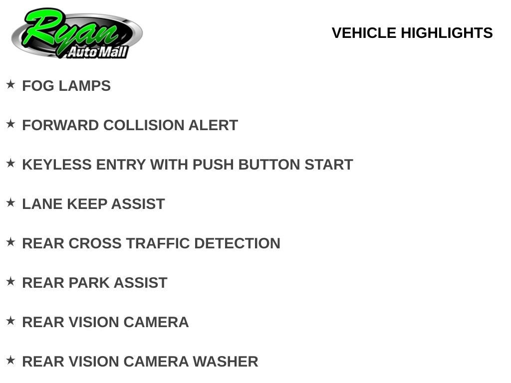 Advanced driver-assist technologies help provide added confidence behind the wheel. These features include adaptive cruise control, forward collision alert, lane keep assist, automatic high beam headlamps, fog lamps, side blind spot monitoring, rear cross traffic detection, rear park assist, surround vision, and a rear vision camera with washer.