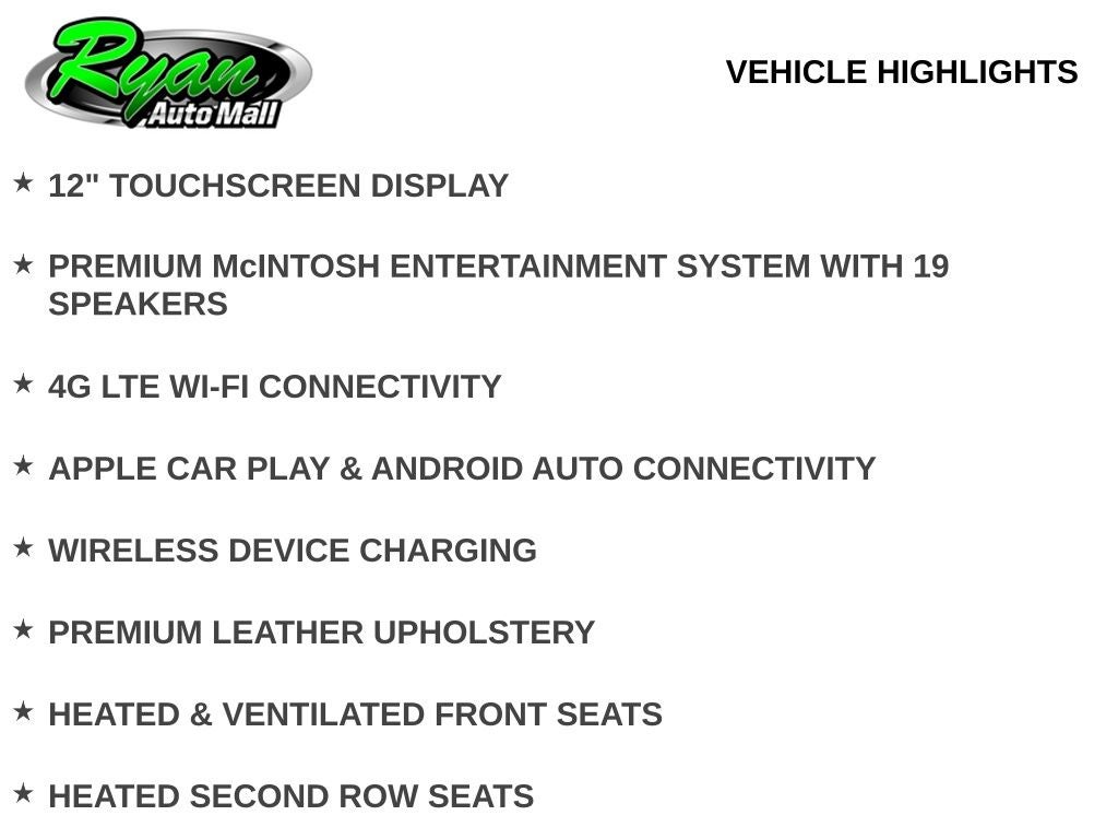 Technology is front and center, led by a 12-inch touchscreen infotainment system with built-in navigation, Apple CarPlay and Android Auto integration, and 4G LTE Wi-Fi capability. The 19-speaker McIntosh premium audio system fills the cabin with concert-quality sound, while wireless charging, multiple USB ports, and a 120-volt outlet keep everyone connected on the go. The rear camera digital mirror, head-up display, and surround-view camera system enhance visibility for safe maneuvering around city streets and tight spaces.