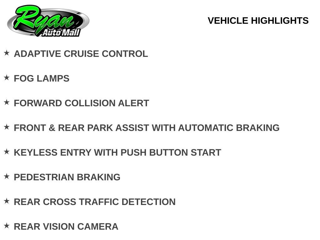 Safety and driver assistance features include adaptive cruise control, active lane management, forward collision warning with pedestrian braking, blind spot monitoring, rear cross traffic detection, and front and rear park assist with automatic braking. A rear vision camera and keyless entry with push-button start provide added confidence and convenience.