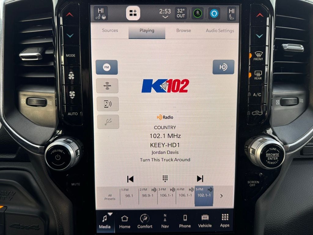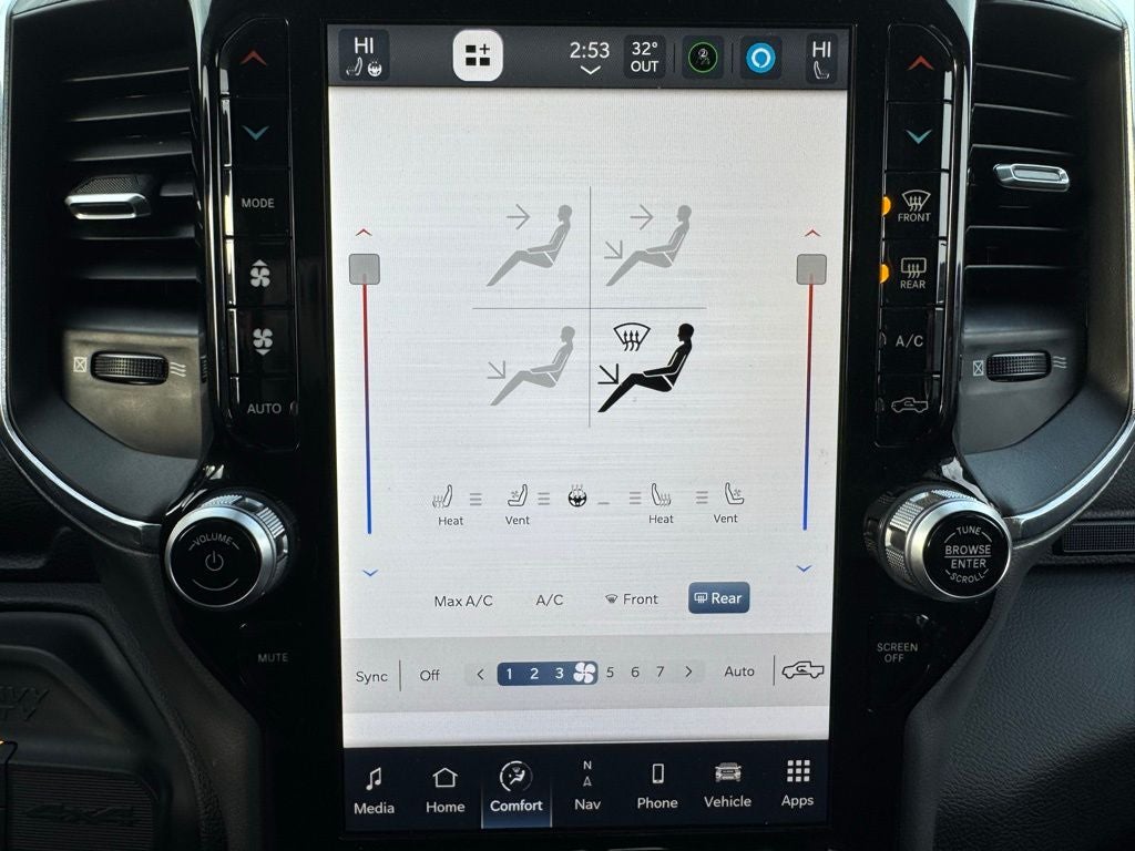 Inside the cabin, the Laramie offers luxury and practicality with leather-trimmed upholstery, heated and ventilated front seats, heated second-row seats, a heated steering wheel, power driver and passenger seats with memory settings, bucket seating, multi-zone automatic climate control, power adjustable pedals, a universal garage door controller, a 120-volt power outlet, wireless device charging, and a rear window defroster. The 12-inch touchscreen display with built-in navigation, Apple CarPlay, Android Auto, 4G LTE Wi-Fi, and the premium Harman Kardon audio system creates a highly connected, premium driving environment. The Level B Equipment Group and Night Edition package further elevate the truck with added technology, convenience features, and bold exterior styling.