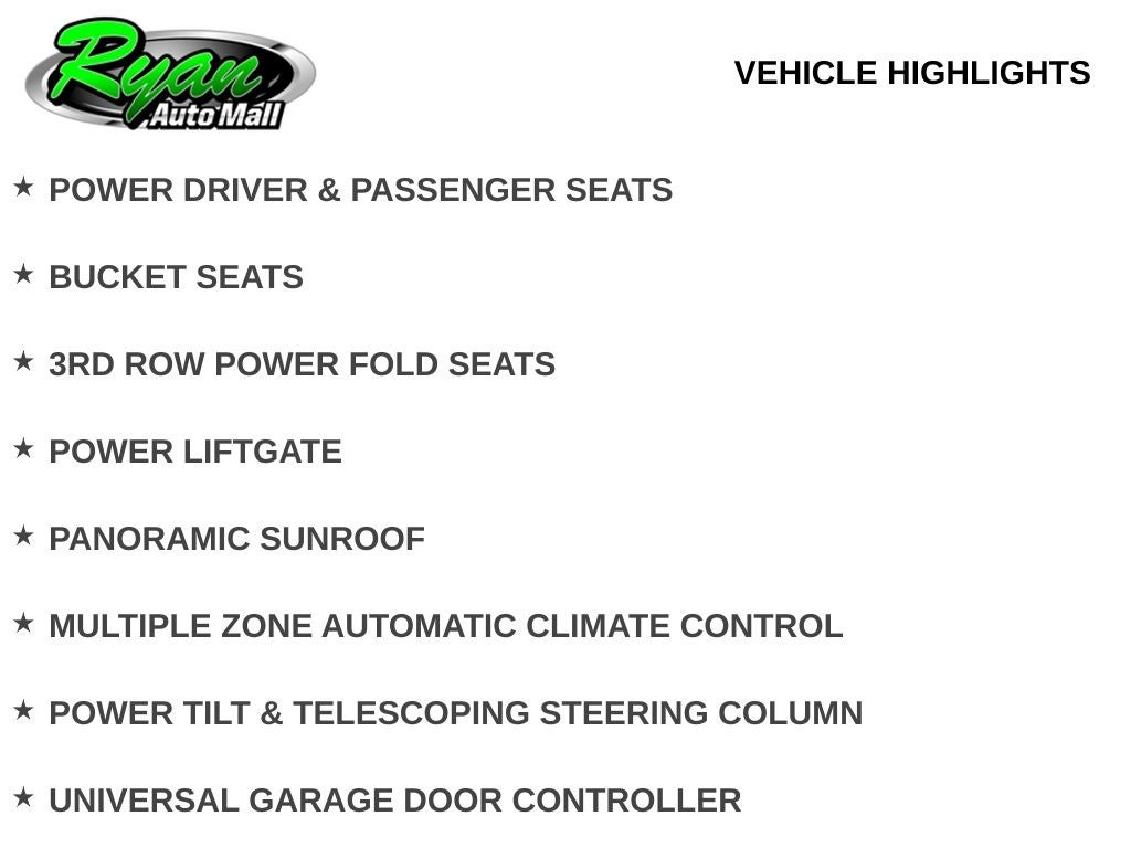 Comfort and convenience features include an integrated navigation system, a premium Bang & Olufsen sound system, 4G LTE Wi-Fi connectivity, wireless device charging, and full leather upholstery. Heated front seats, a heated steering wheel, power-adjustable driver and passenger seats with memory settings, power tilt and telescoping steering column, and multiple zone automatic climate control enhance the driving experience. The power panoramic sunroof brings natural light into the cabin, while the power liftgate and power-folding third-row seats provide flexibility for passengers and cargo alike.