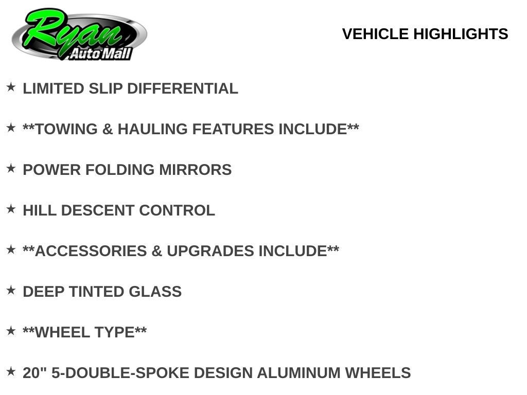 Advanced safety and driver-assist features include adaptive cruise control, automatic emergency braking, forward collision alert, lane departure warning, blind spot monitoring, rear cross traffic detection, automatic high beam headlamps, automatic headlamp leveling, fog lamps, and a rear vision camera to help keep you confident behind the wheel. Performance and capability are further supported by a limited slip differential, power folding mirrors, and hill descent control.