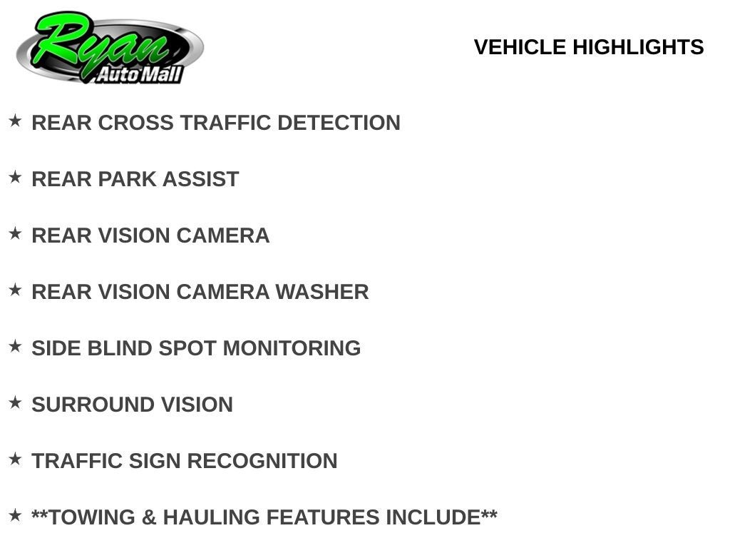 - Technology Package includes (KSG) Advanced Adaptive Cruise Control, (UGN) Enhanced Automatic Emergency Braking, (UV2) HD Surround Vision, (CTB) Intersection Automatic Emergency Braking, (UKM) Lane Keep Assist with Lane Departure Warning, (UKK) Rear Pedestrian Alert, (UOW) Side Bicyclist Alert, (UVX) Traffic Sign Recognition, (DYX) outside heated power-adjustable mirrors and (TCP) AutoSense hands-free power programmable liftgate