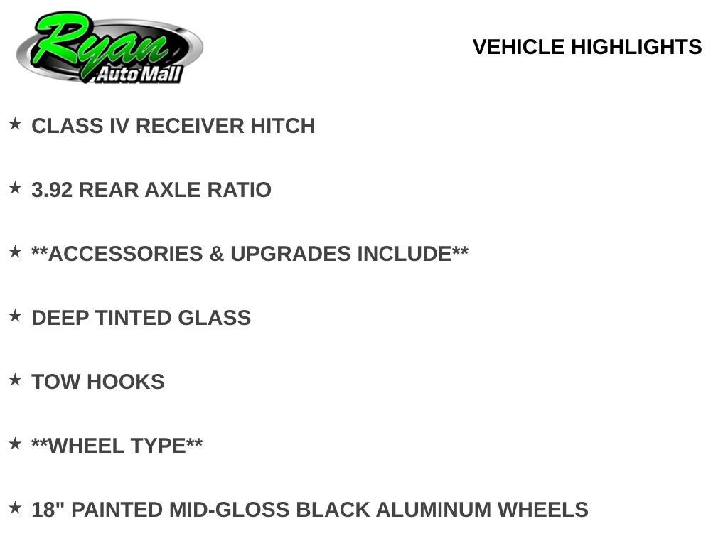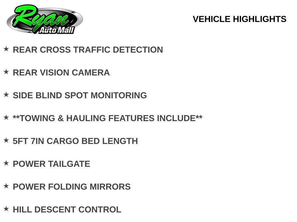 For towing and hauling, this truck is engineered to perform. The 3.92 rear axle ratio, Hill Descent Control, Class IV receiver hitch, power tailgate, and power-folding mirrors make it a dependable companion for work or play. The 5-foot 7-inch cargo bed and sturdy tow hooks add practicality and utility, while deep-tinted glass completes the bold look.
